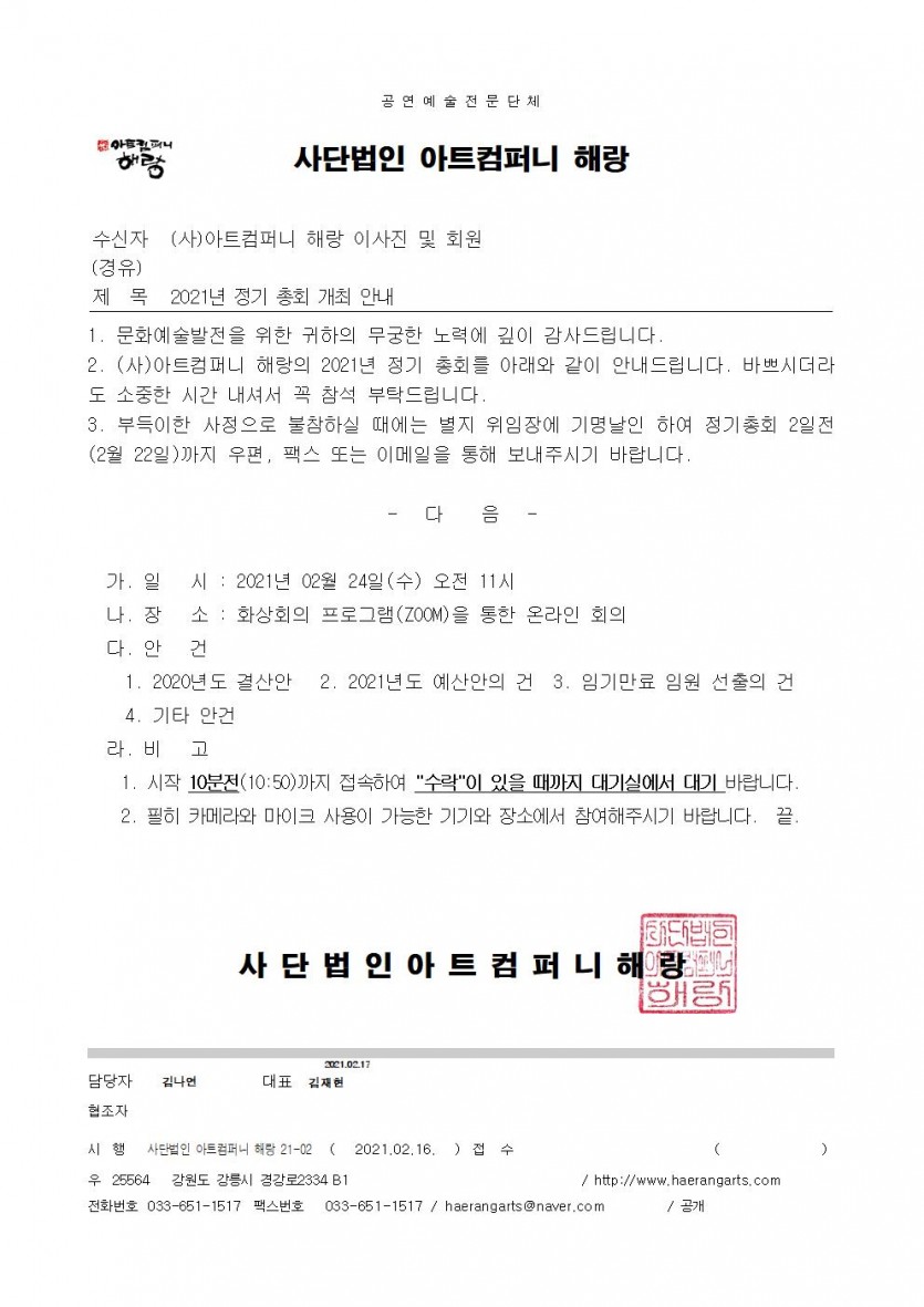 이전글 목록 다음글 2021년 아트컴퍼니 해랑 정기총회 개최 안내 최고관리자 21-02-17 15:39 2,058 2021년 아트컴퍼니 해랑 정기총회를 다음과 같이 개최하고자 하오니 회원 여러분들의 적극 참여 부탁드립니다. 댓글 0 이전글 목록 다음글