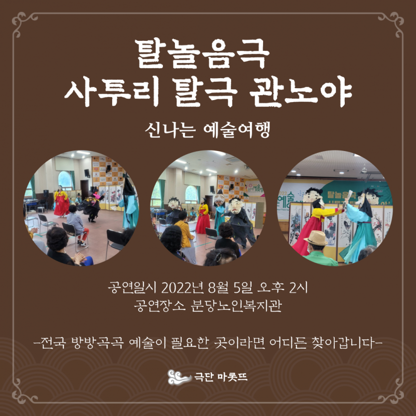 - 이전글2022년 신나는 예술여행 극단 마롯뜨 찾아가는 탈놀음극 '사투리 탈극 관노야' 22.08.09