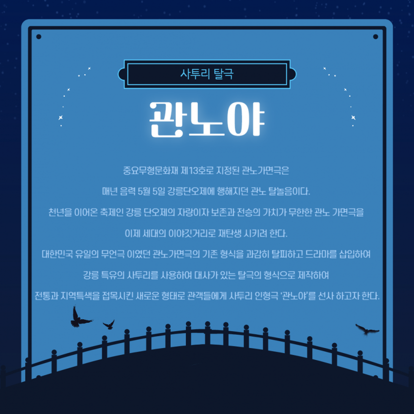 대한민국 유일의 무언극 이었던 관노가면극을 강릉 특유의 사투리를 사용하여 전통과 지역특색을 접목시킨 새로운 형태로